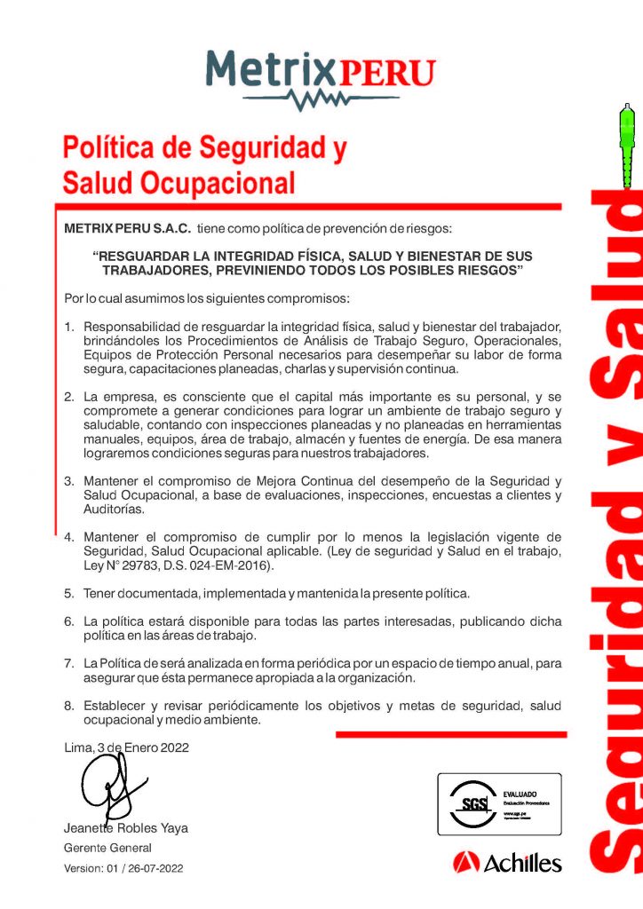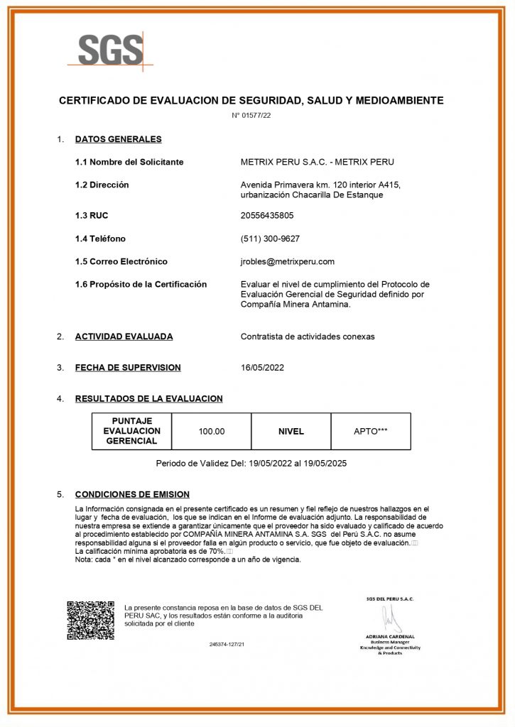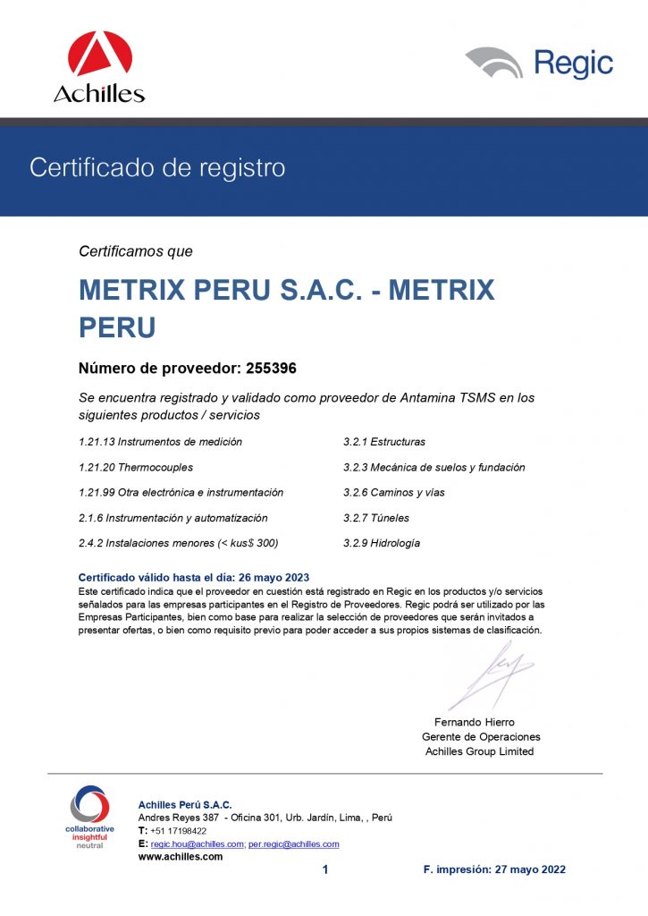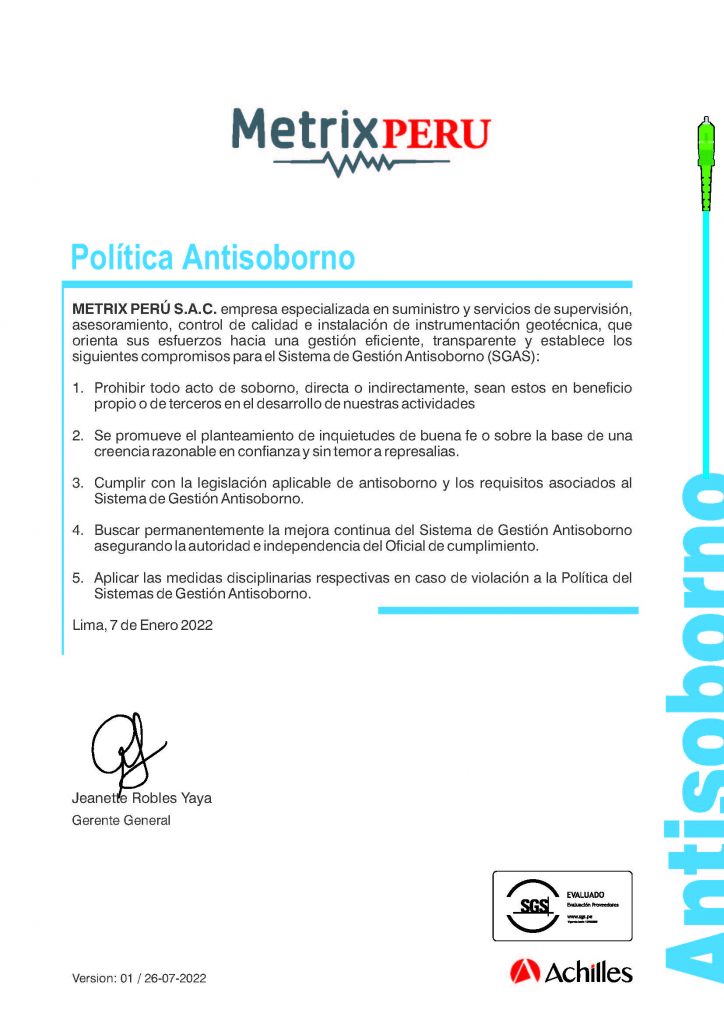 METRIX PERU SAC es una empresa peruana que se constituyó en alianza estratégica con GEOMEDICIONES Limitada de Chile, empresa reconocida y de gran trayectoria en instrumentación geotécnica con el empleo de fibra óptica y otras tecnologías de punta, con aplicación a la geotecnia.