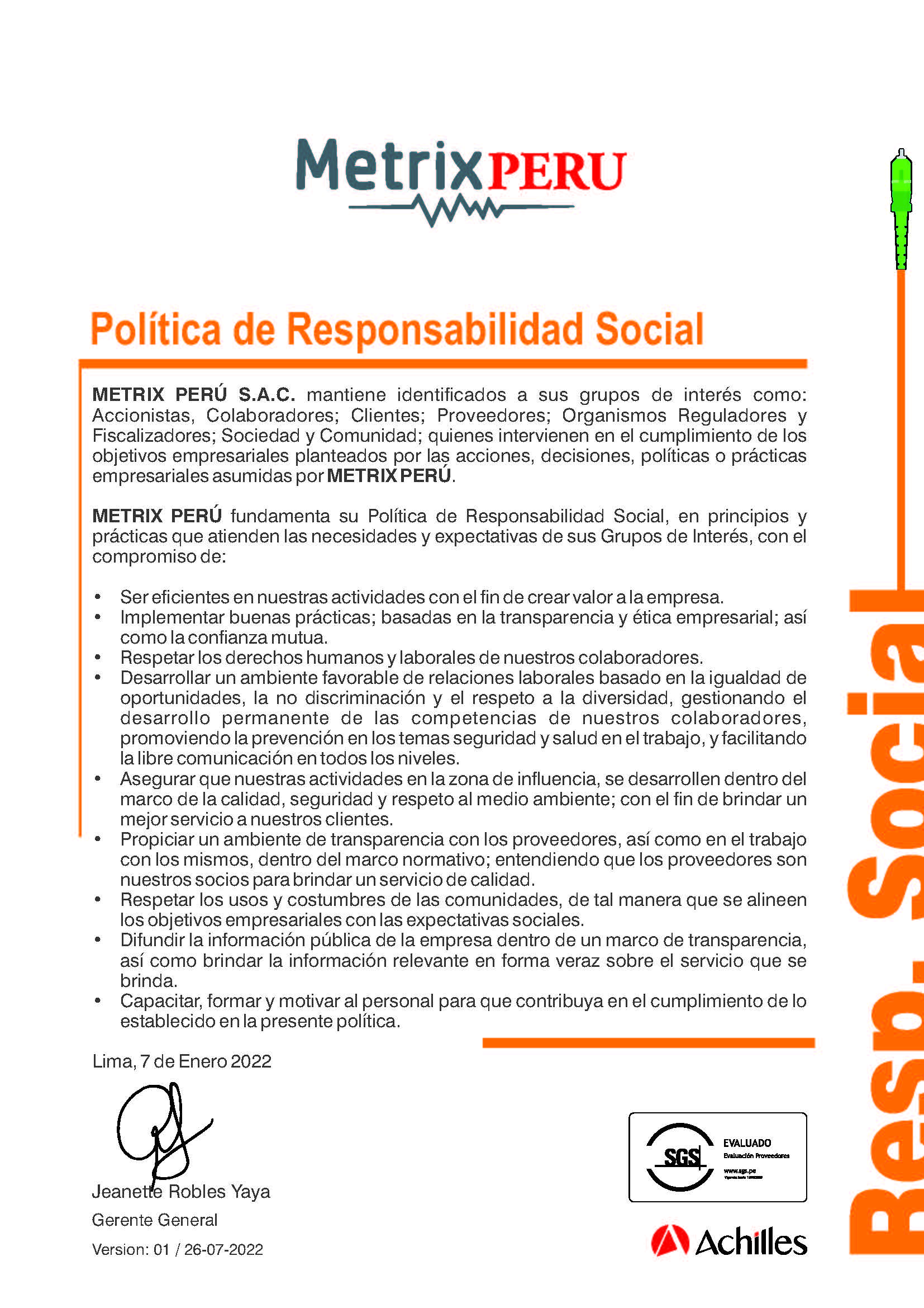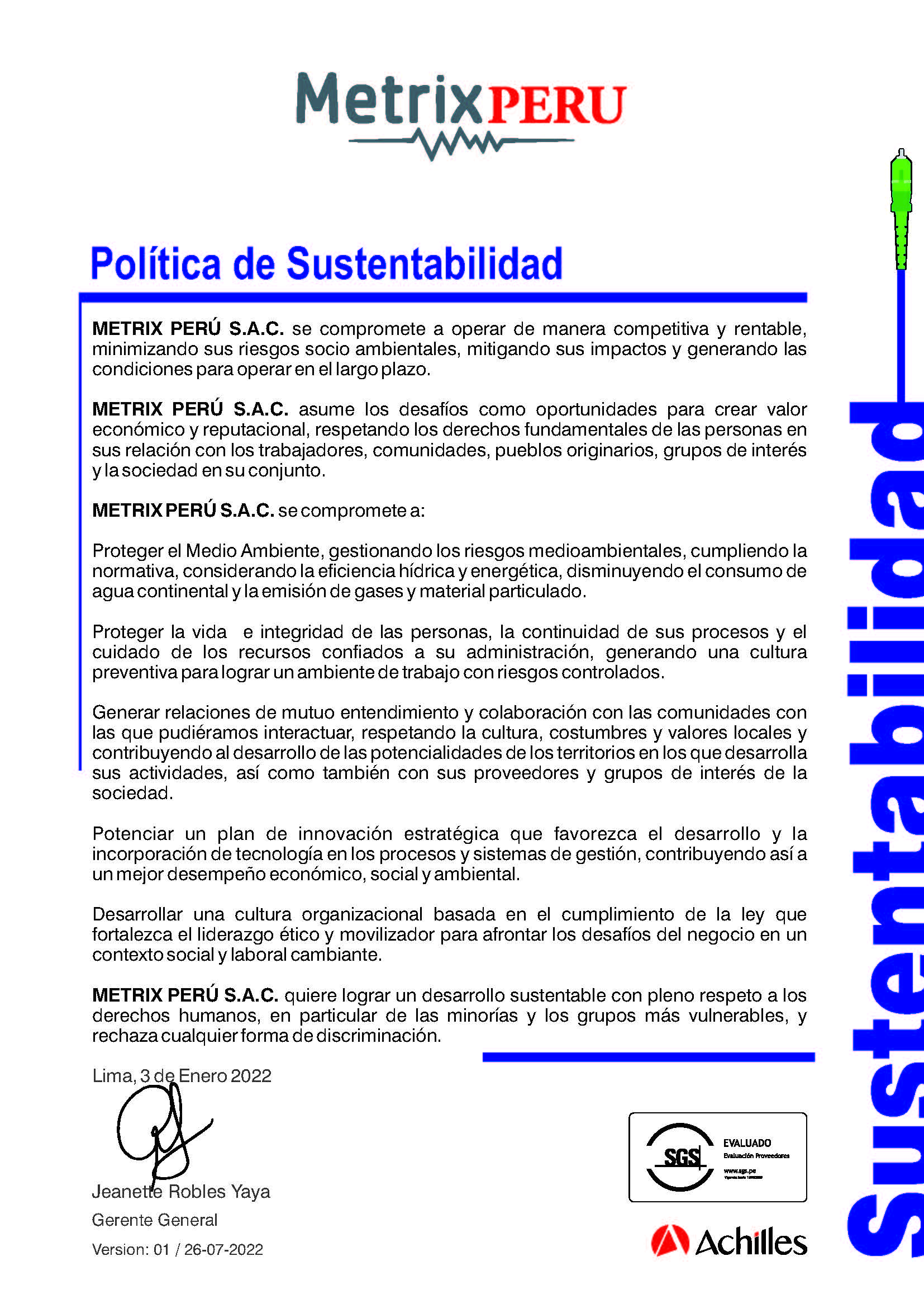 Practicamos políticas de principios y valores en el ámbito laboral, comercial, medioambiental y gubernamental, preocupándonos por aplicar los ODS en nuestras operaciones rumbo al desarrollo sostenible global.